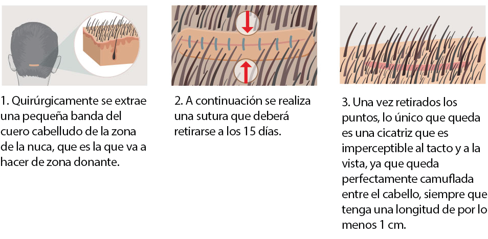Al contrario, la técnica FUSS o FUT, retira una banda o tira de cuero cabelludo de la zona occipital, situada encima de la nuca. Esta técnica la realiza siempre el Cirujano plástico, ya que posteriormente hay que realizar una sutura de la zona y si el médico especialista no es plástico, se suele dejar una cicatriz mucho peor. La banda de cuero cabelludo que se ha extraído, pasa ser trabajada por e equipo de auxiliares técnicos, que irán separando con minuciosidad cada Unidad Folicular para injertarla después.